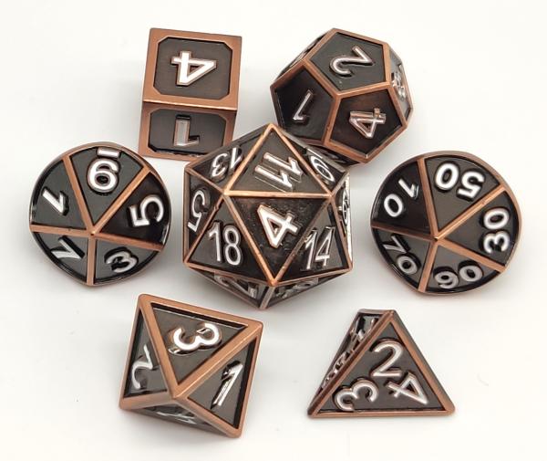 Complete set of seven sharp-edged polyhedral dice, hand poured, polished and sanded to extraordinary fineness.Hand-made, hand-sanded, hand-polished sharp-edged dice.Seven polyhedral dice.Hand-made and hand-engraved. Recommended for use in dice trays.